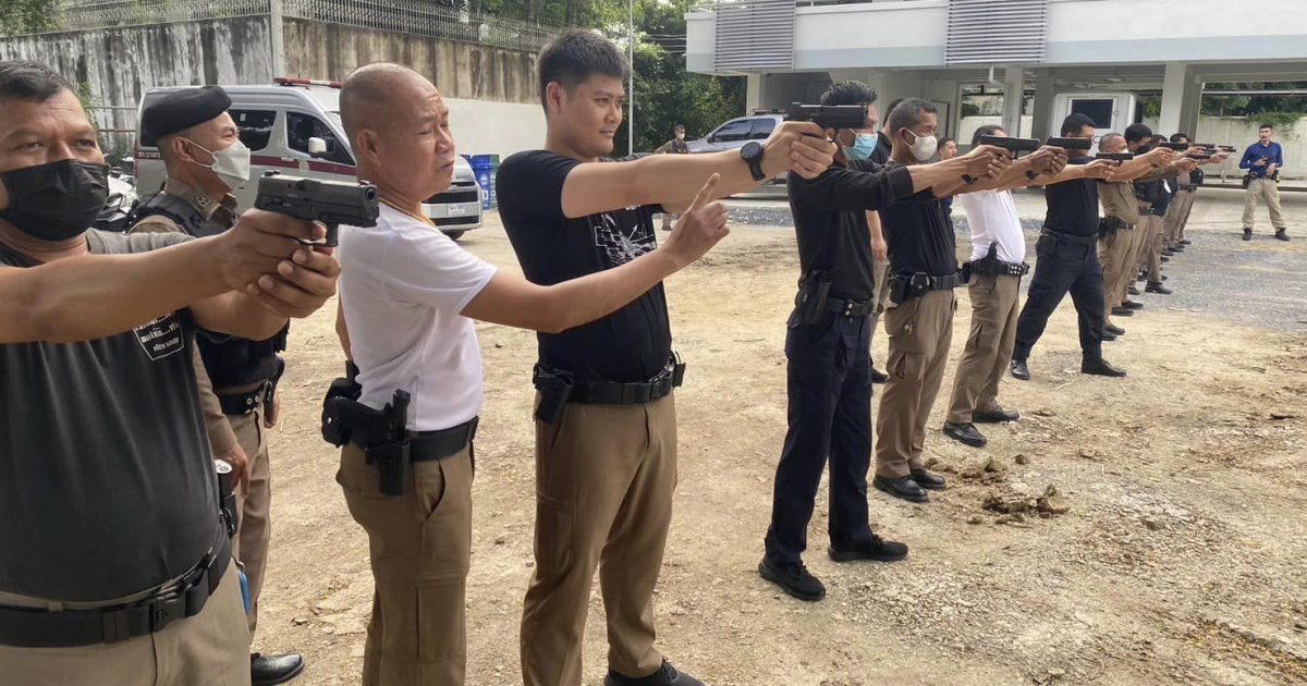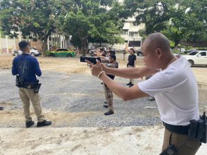 – ฝึกภาคทฤษฎีแก่ข้าราชการตำรวจ ตามวิดีทัศน์ฝึกทักษะยิงปืน ของทาง ตร